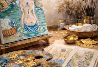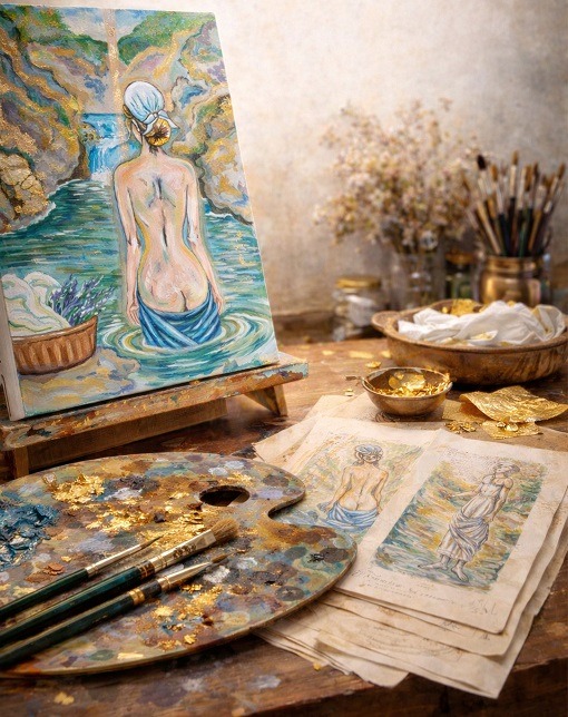 La feuille d’or et la lumière du Luberon se mêlent au geste artistique.