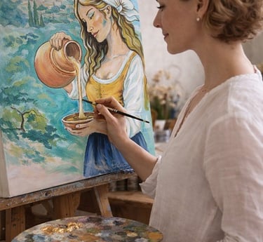 Création de tableaux mêlant peinture et feuille d’or, dans un espace baigné de lumière naturelle.